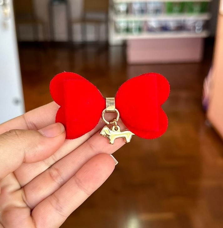 | Laço | Vermelho com pingente de cachorrinho, Docinho com pingente de coração, Coração em tricot, Brasil |