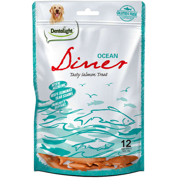 O nosso Ocean Diner Salmão é um petisco natural, composto de antioxidantes naturais e propriedades anti-inflamatórias (Cranberry, Vitamina C, Eufrásia e Óleo de linhaça) que ajudam a eliminar manchas, aumentando a imunidade e promovendo a saúde da pele. Além de uma textura deliciosamente mastigável que combate a placa bacteriana e o tártaro, o seu cão mal pode esperar para mastigar este tratamento livre de cereais.