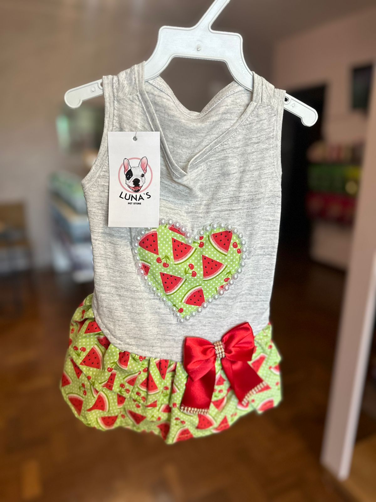 Vestido Cinza com Verde Com Coração Estampado De Melancias